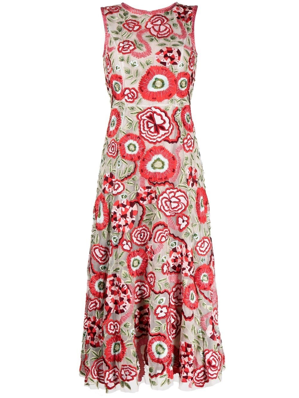 floral-embroidered dress red/ multicolour all-over floral embroidery tulle overlay flared skirt scoop neck sleeveless concealed rear zip fastening Imported Composition Outer: Nylon 100% SIZE & FIT Model measurements Height 5 ft 11 in(1.8 m) Bust/Chest 28.34 in(72 cm) Hips 35.43 in(90 cm) Waist 23.62 in(60 cm) Washing instructions Dry Clean Only