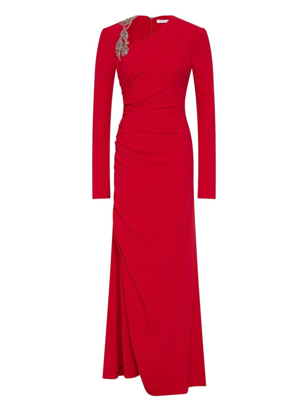 Gabrielle gown dress Highlights - Red - Crystal embellishment - Asymmetrical neckline - Gathered detail - Side slit Imported Composition Acetate 79%, Polyester 21% Washing instructions Dry Clean Only
