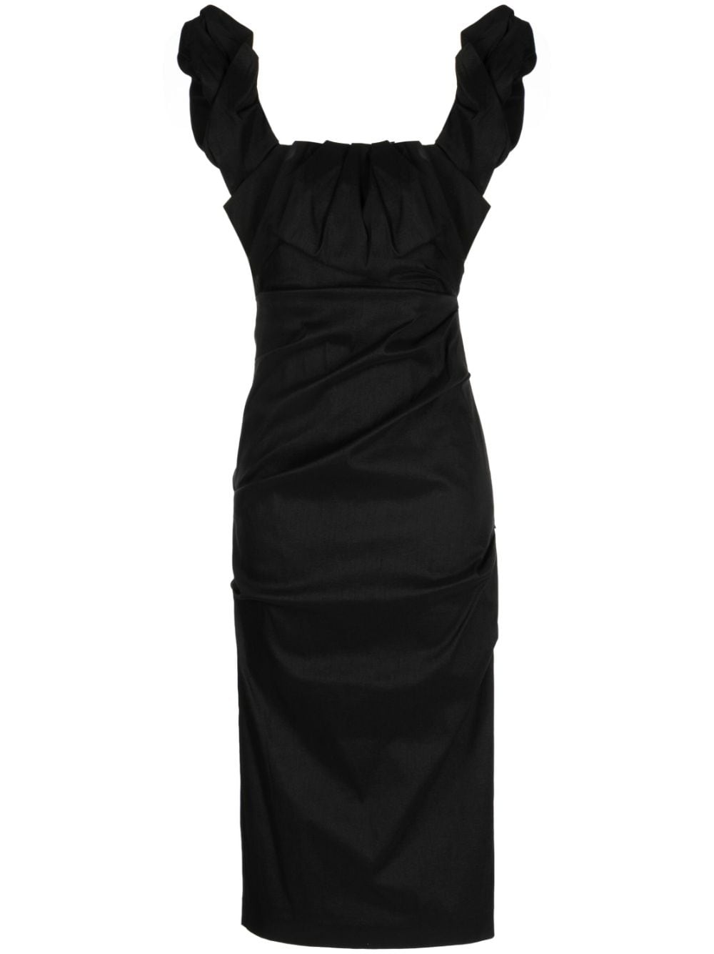 Kalina draped sleeveless dress Highlights - Kalina draped sleeveless dress from rachel gilbert featuring black, square neck, sleeveless, ruffled detailing, rear slit, concealed rear hook and zip fastening and long length. Imported Composition Body: Polyester 55%, Nylon 45% Lining: Polyester 100% SIZE & FIT Model measurements Height 5 ft 10 in(1.77 m) Bust/Chest 31.49 in(80 cm) Hips 35.43 in(90 cm) Waist 25.19 in(64 cm) FittingInformation Designed for a very close and sculpting fit Made from a midweight non-stretch fabric This piece fits true to size – take your usual size