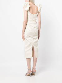 Kalina ruched midi dress This Kalina dress reflects Rachel Gilbert’s artful aesthetic. Rendered in a coconut-white hue, it’s decorated with ruffled sleeves and ruched detailing. Highlights - White - Crepe texture - Ruffled trim - Square neck - Concealed rear zip fastening - Sleeveless - Central rear vent - Calf-length - Straight hem Imported Composition Polyester 55%, Nylon 45% SIZE & FIT Model measurements Height 5 ft 10 in(1.77 m) Bust/Chest 31.88 in(81 cm) Hips 33.85 in(86 cm) Waist 24.01 in(61 cm)