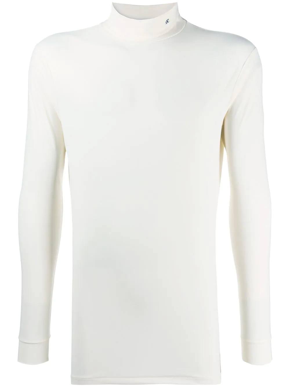 embroidered logo turtleneck top All eyes on you or all white on you? This comfortable and elegant embroidered logo turtleneck top from Raf Simons will make you have both. Less is more. Highlights - White - Roll neck - Long sleeves - Straight hem - Embroidered logo to the neck Imported Composition Polyamide 68%, Spandex/Elastane 32% SIZE & FIT Model measurements Height 6 ft 1 in(1.86 m) Bust/Chest 36.61 in(93 cm) Hips 36.61 in(93 cm) Waist 29.92 in(76 cm) Measurement CHEST 38.58 in(98 cm) SLEEVE LENGTH 25.98 in(66 cm) LENGTH 28.34 in(72 cm) FittingInformation This piece fits true to size. We recommend you get your regular size Cut for a slim fit Made with a mid-weight stretch fabric