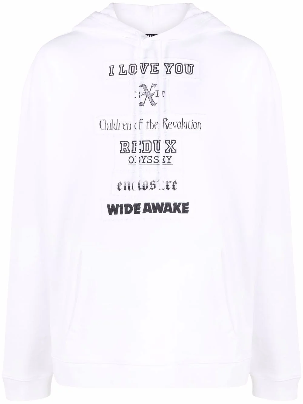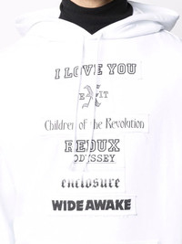 I Love You hoodie Each season, Raf Simons continues to present a line-up of distressed, patchwork-packed pieces all with a bold attitude, like this I Love You hoodie. Crafted from white cotton, the classic fit is finished with an amalgamation of patchwork slogans printed across the chest and a rear portrait print for that signature tough-luxe edge. Imported Composition Cotton 100% SIZE & FIT Model measurements Height 6 ft 3 in(1.9 m) Bust/Chest 38.18 in(97 cm) Hips 37.79 in(96 cm) Waist 32.67 in(83 cm) FittingInformation This piece fits true to size. We recommend you get your regular size Cut for a loose fit Made with a mid-weight fabric Washing instructions Machine Wash
