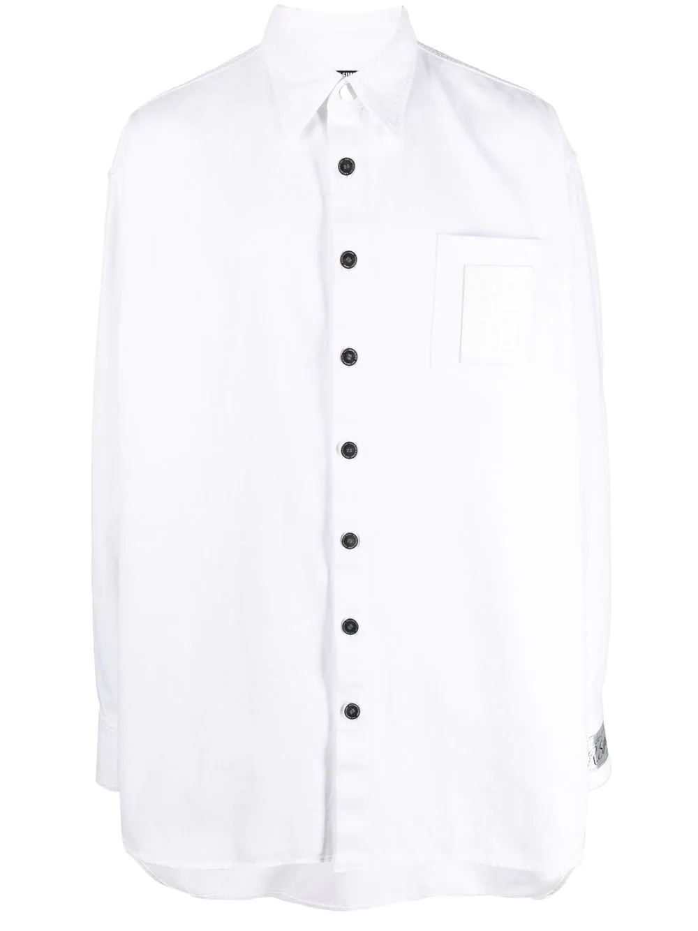 long-sleeve denim shirt optical white cotton straight-point collar front button fastening drop shoulder long sleeves buttoned cuffs chest patch pocket straight hem Made in Italy Composition Cotton 100% SIZE & FIT Model measurements Height 6 ft 1 in(1.86 m) Bust/Chest 34.64 in(88 cm) Hips 35.43 in(90 cm) Waist 27.16 in(69 cm) Measurement CHEST 69.29 in(176 cm) SLEEVE LENGTH 25.19 in(64 cm) LENGTH 34.64 in(88 cm) WAIST 70.86 in(180 cm) Shoulder Width 22.83 in(58 cm) FittingInformation This piece fits true to size. We recommend you get your regular size Cut for an oversized fit Made with a mid-weight non-stretch fabric Washing instructions Machine Wash