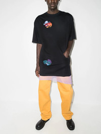 Pocket Holes oversized T-shirt A testament to the dark, grundy look that characterises the brand, Raf Simons' T-shirt is decorated with pink-style details at the front. Crafted from black cotton, it is cut to an oversize silhouette as yet another clue to the brand's subversive nature. Imported Composition Cotton 100% SIZE & FIT Model measurements Height 6 ft 2 in(1.87 m) Bust/Chest 36.41 in(92.5 cm) Hips 37 in(94 cm) Waist 29.52 in(75 cm) FittingInformation This piece fits true to size. We recommend you get your regular size Cut for an oversized fit Made with a mid-weight fabric Washing instructions Machine Wash