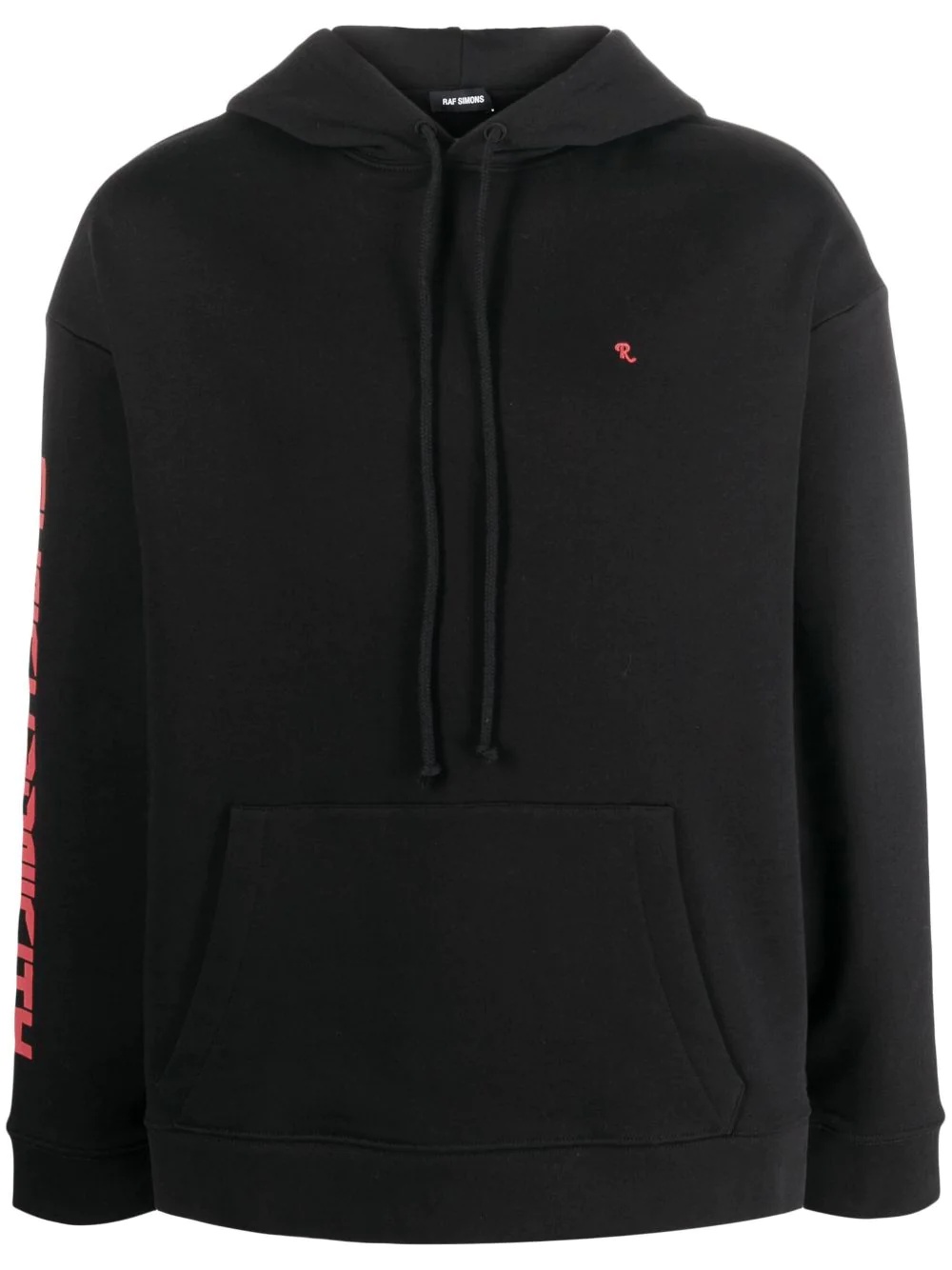 synchronicity print hoodie Raf Simons injects their signature brand details to this black cotton hoodie with an embroidered logo to the chest and a patch towards the rear. Imported Composition Cotton 100% SIZE & FIT Model measurements Height 6 ft 1 in(1.85 m) Bust/Chest 34.64 in(88 cm) Hips 34.25 in(87 cm) Waist 27.55 in(70 cm) FittingInformation This piece fits true to size. We recommend you get your regular size Cut for a loose fit Made with a mid-weight fabric Washing instructions Machine Wash