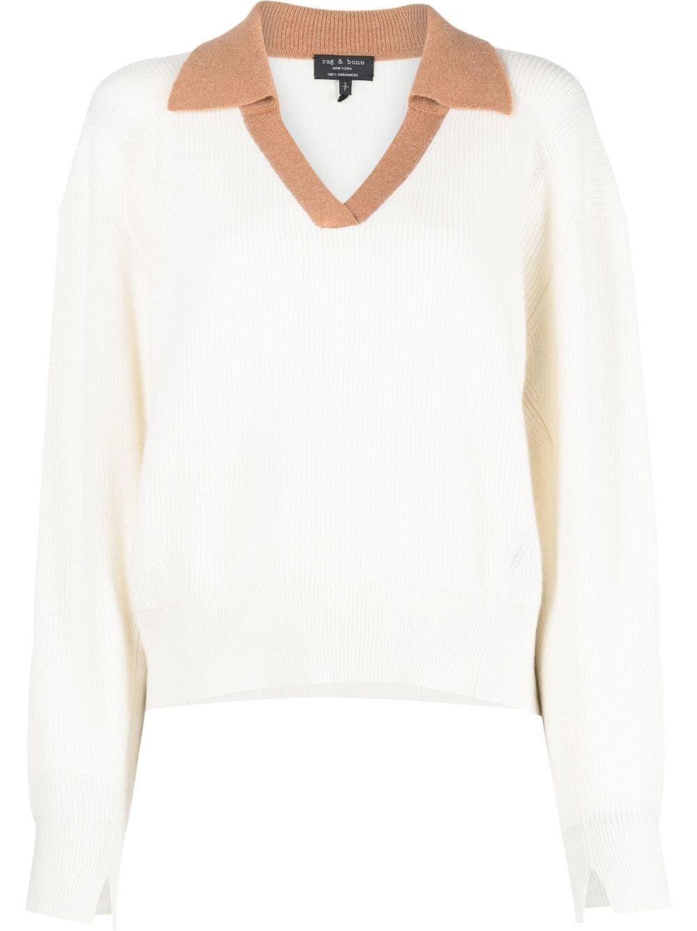 collared cashmere jumper collared cashmere jumper from RAG & BONE featuring caramel brown, ivory white, cashmere, fine knit, polo collar, long sleeves and ribbed hem. Imported Composition Cashmere 100% SIZE & FIT Model measurements Height 5 ft 9 in(1.74 m) Bust/Chest 32.28 in(82 cm) Hips 35.82 in(91 cm) Waist 24.01 in(61 cm) FittingInformation This piece fits true to size. We recommend you get your regular size Cut for a loose fit Made with a mid-weight fabric Washing instructions Dry Clean Only