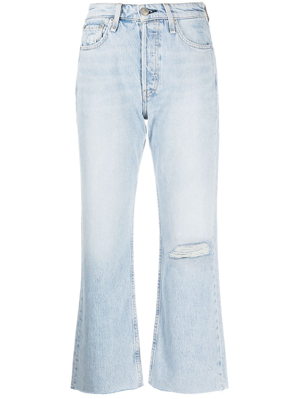Maya high-rise cropped flared jeans light blue cotton distressed finish stonewashed frayed edge high waist button fly fastening belt loops classic five pockets flared design cropped Made in United States Composition Cotton 100% SIZE & FIT Model measurements Height 5 ft 10 in(1.77 m) Bust/Chest 31.88 in(81 cm) Hips 34.64 in(88 cm) Waist 24.01 in(61 cm) FittingInformation This piece fits true to size. We recommend you get your regular size Designed to be fitted at the waist and hips, loose over the leg Made with a mid-weight non-stretch fabric Washing instructions Machine Wash