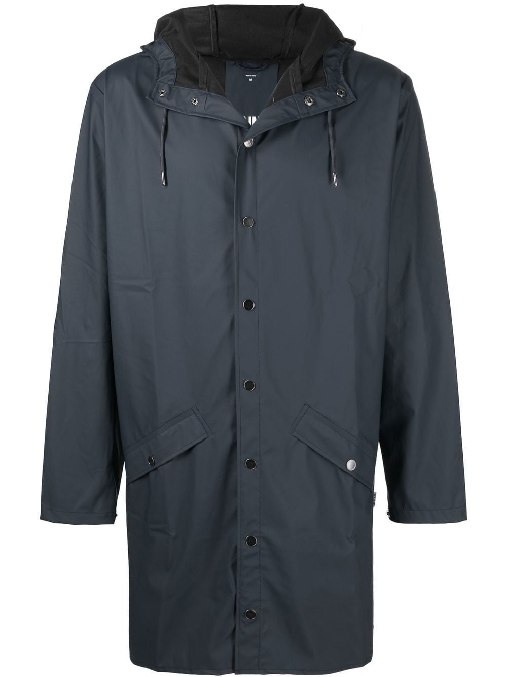 drawstring hood raincoat Highlights - Navy blue - Drawstring hood - Front press-stud fastening - Long sleeves - Two front flap pockets - Mid-length - When buying this unisex item, keep in mind that it is graded in standard men's sizing. Imported Composition Polyester 100%, Polyurethane 100% SIZE & FIT Model measurements Height 5 ft 10 in(1.79 m) Bust/Chest 33.07 in(84 cm) Hips 35.82 in(91 cm) Waist 24.01 in(61 cm) FittingInformation This piece is unisex. Please take care when selecting your size Designed for a loose fit for men and an oversized fit for women Made with a lightweight fabric Washing instructions Machine Wash