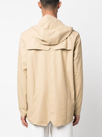hooded waterproof jacket This jacket from RAINS is engineered for practicality. Fitted with a drawstring hood, this waterproof design boasts a lightweight construction. Highlights - Almond beige - Waterproof - Windproof - Drawstring hood - Front press-stud fastening - Long sleeves - Two button-fastening pockets - Rear curved hem - When buying this unisex item, keep in mind that it is graded in standard men's sizing. Made in United Kingdom Composition Polyester 100%, Polyurethane 100% SIZE & FIT Model measurements Height 5 ft 10 in(1.78 m) Bust/Chest 31.49 in(80 cm) Hips 36.22 in(92 cm) Waist 25.59 in(65 cm) FittingInformation This unisex piece is designed for a loose fit whether you usually select women's or men's sizes Made from a lightweight non-stretch fabric, this piece offers minimal elasticity when worn Washing instructions Machine Wash