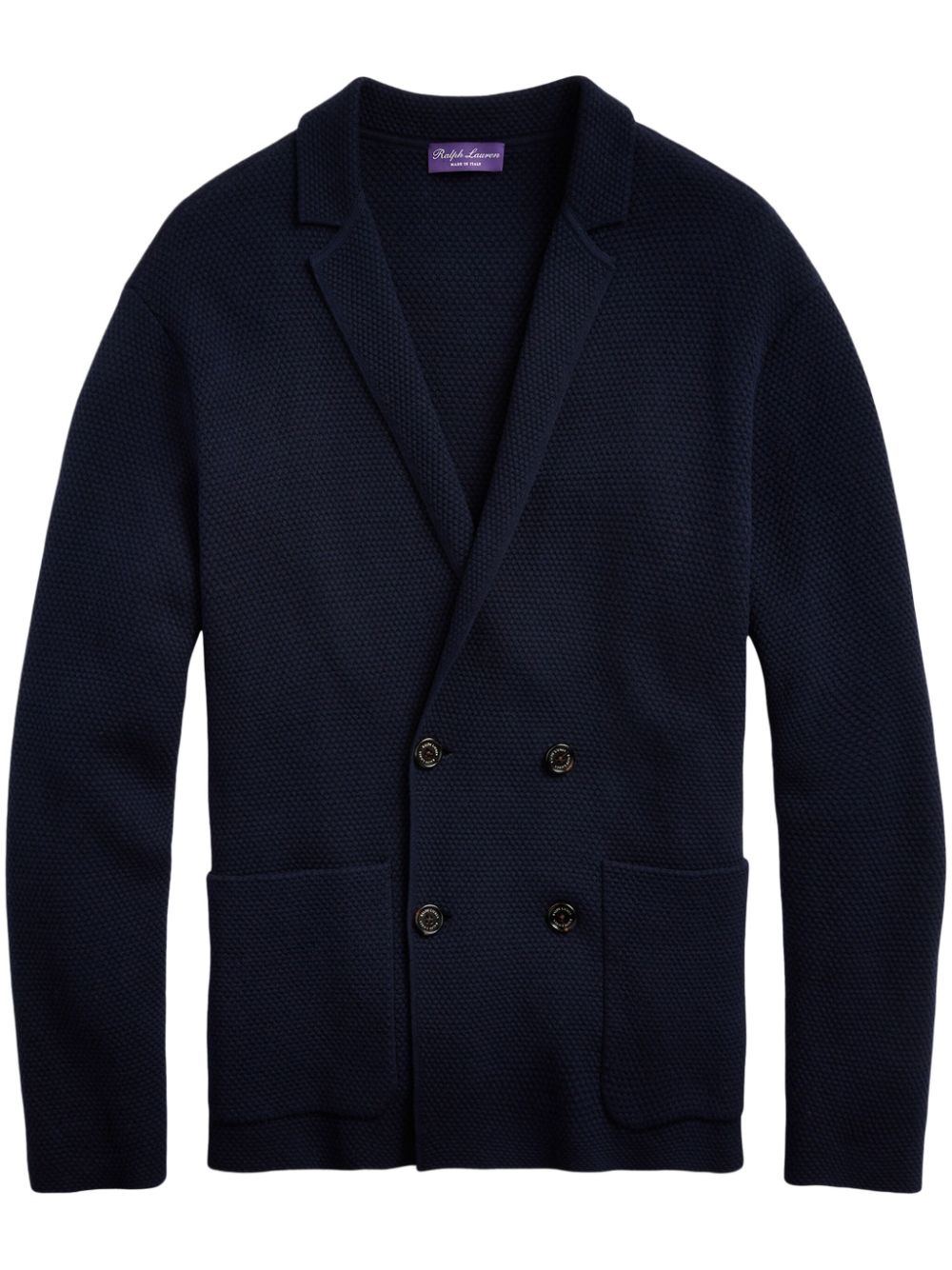 double-breasted cardigan Highlights - Navy blue - Front button fastening - Notched lapels - Two front patch pockets Imported Composition Viscose 54%, Wool 24%, Nylon 22%