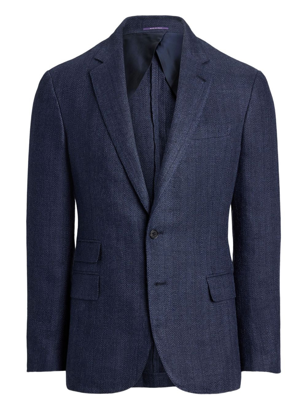 herringbone blazer Highlights - Navy blue - Notched lapels - Three front pockets - Single-button fastening Made in Italy Composition Linen/Flax 66%, Tussar Silk 23%, Cotton 11% Washing instructions Read Manufacturer Guidelines