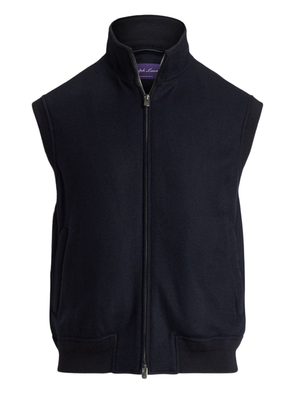 zip-up gilet Highlights - Navy blue - Stand-up collar - Front zip fastening - Ribbed trim - Two side pockets Made in Italy Composition Silk 100%, Sheep Suede 100%, Cashmere 98%, Polyamide 2% Washing instructions Read Manufacturer Guidelines