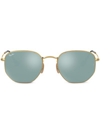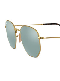 hexagonal shaped sunglasses Gold-tone metal hexagonal shaped sunglasses from Ray-Ban featuring mirrored lenses, tortoiseshell detailing and straight arms with curved tips. This item comes with a protective case. Made in Italy Composition Metal 100% SIZE & FIT Measurement Arm Length 5.7 in(14.5 cm) Bridge Width 0.82 in(2.1 cm) Lens Diameter 2 in(5.1 cm)