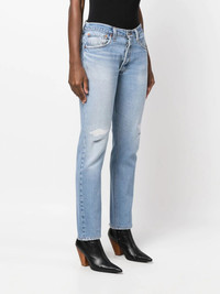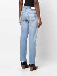 distressed straight-leg jeans Highlights - Indigo blue - Cotton - Distressed effect - Ripped detailing - Logo patch to the rear - Classic five pockets - Mid-rise - Belt loops - Front button and zip fastening - Straight leg - Cropped leg Made in United States Composition Lining: Polyester 65%, Cotton 35% Outer: Cotton 100% SIZE & FIT Model measurements Height 5 ft 10 in(1.77 m) Bust/Chest 34.64 in(88 cm) Hips 35.43 in(90 cm) Waist 24.8 in(63 cm) Washing instructions Machine Wash