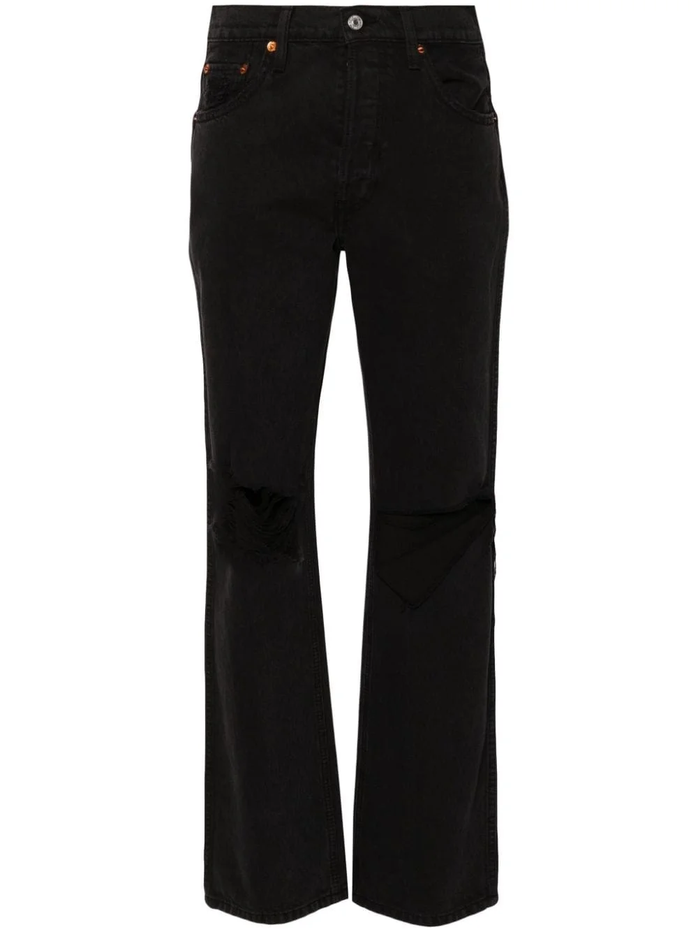 high-waisted flared-leg jeans Highlights - Black - Cotton - Denim - Distressed effect - High-rise - Belt loops - Classic five pockets - Rivet detailing - Ripped detailing at the knee - Full-length - Logo patch to the rear - Straight leg - Concealed fly and button fastening Made in United States Composition Cotton 100% SIZE & FIT Model measurements Height 5 ft 10 in(1.77 m) Bust/Chest 32.28 in(82 cm) Hips 35.03 in(89 cm) Waist 25.19 in(64 cm) Measurement FRONT RISE 11.02 in(28 cm) INSIDE LEG 31.88 in(81 cm) BACK RISE 13.77 in(35 cm) HIPS 34.64 in(88 cm) WAIST 26.77 in(68 cm) FittingInformation Designed for a straight-leg fit, these jeans allow for a close fit at the waist and an unrestricted and comfortable fit over the leg Sturdy and hard-wearing, this denim piece offers no stretch This piece fits true to size – take your usual size