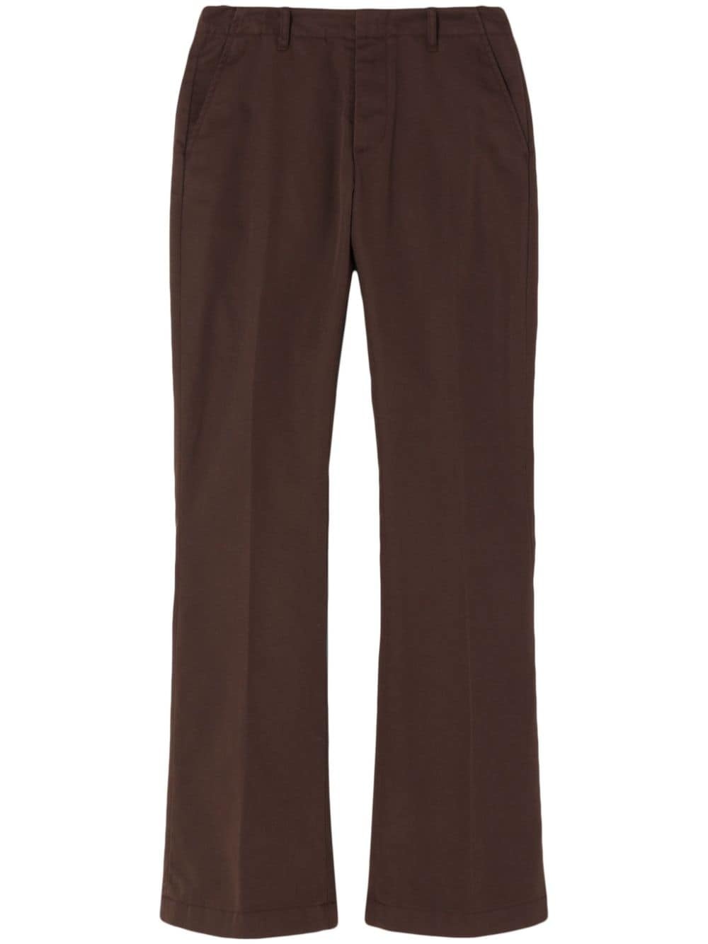 pressed-crease cotton-blend flared trousers Highlights - Chocolate brown - Cotton blend - Pressed crease - Mid-rise - Belt loops - Flared - Concealed front fastening - Two side slash pockets - Two rear jetted pockets - Straight hem Made in United States Composition Polyester 65%, Cotton 35% SIZE & FIT Measurement FRONT RISE 11.81 in(30 cm) HIPS 40.15 in(102 cm) WAIST 29.92 in(76 cm) Washing instructions Hand Wash