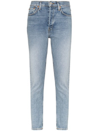 slim-fit cropped jeans It's not about your genes, it's all about what jeans you're wearing. Cut from blue cotton-blend denim, these slim-fit jeans from RE/DONE will be your new go-to pair. You won't want to take them off. Highlights - Blue - Cotton-blend denim - Skinny fit - High waist - Belt loops - Concealed front button fastening - Classic five pockets Made in United States Composition Cotton 96%, Polyester 3%, Spandex/Elastane 1% SIZE & FIT Model measurements Height 5 ft 11 in(1.8 m) Bust/Chest 31.49 in(80 cm) Hips 35.43 in(90 cm) Waist 24.4 in(62 cm) FittingInformation This piece fits true to size. We recommend you get your regular size Cut for a slim fit Made with a mid-weight stretch fabric Measurement WAIST 27.55 in(70 cm) INSIDE LEG 27.16 in(69 cm) Hem Width 5.51 in(14 cm) HIPS 31.49 in(80 cm) FRONT RISE 9.84 in(25 cm) BACK RISE 13.38 in(34 cm) Washing instructions Machine Wash