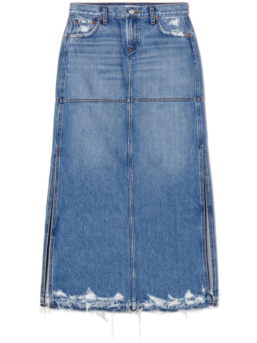 split mid-rise denim skirt Highlights - Blue - Cotton - Washed denim - Whiskering effect - Distressed finish - Concealed fly and button fastening - Belt loops - Classic five pockets - Side slit - Mid-rise - Long length - Frayed hem Imported Composition Cotton 100%