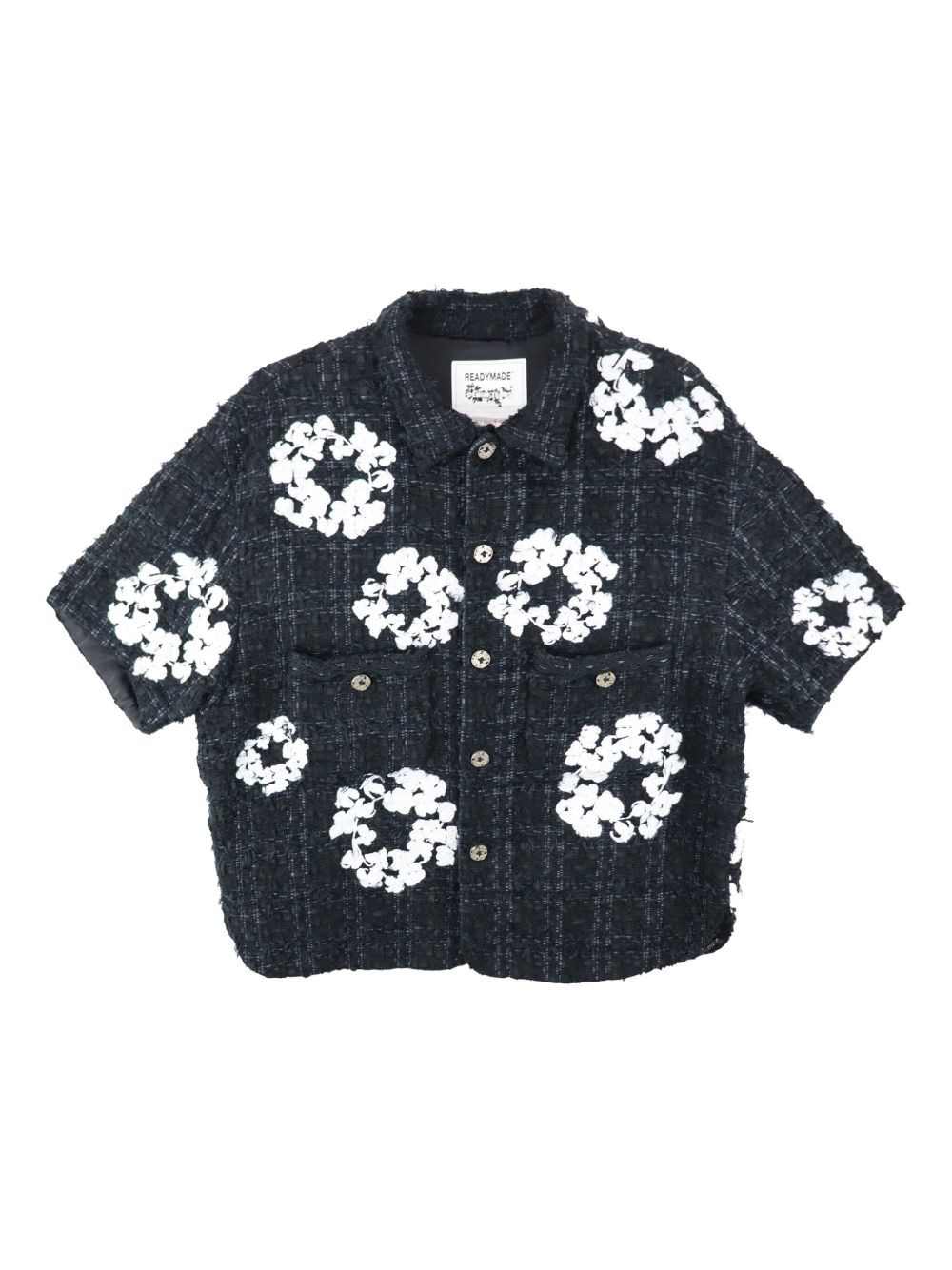 Half wreath-embellished tweed jacket Highlights - Black - Tweed - Wreath embellishment - Short sleeves - Button closure - Patch pockets Imported Composition Outer: Cupro 100%, Cotton 90%, Japanese Paper 10% Lining: Silk 100% Washing instructions Read Manufacturer Guidelines