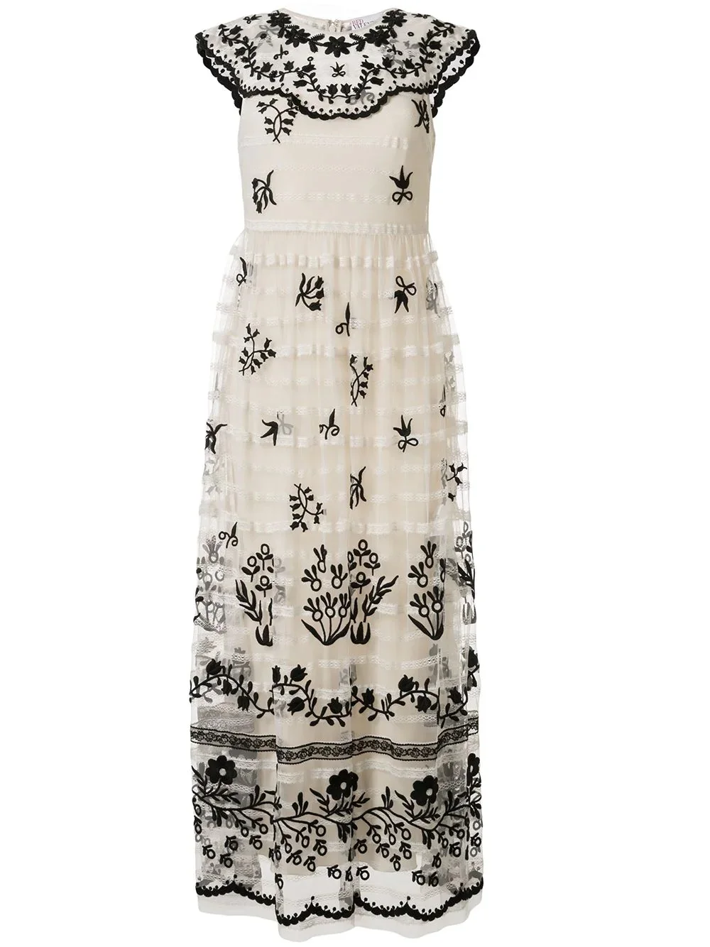floral embroidered maxi dress A little sweet, a little rock-n-roll, this dress from RED Valentino is a total show-stopper. Crafted with embroidered and tulle panels, this dress has cap sleeves. It's time to strut. Featuring a round neck, cap sleeves and a concealed rear zip fastening. Imported Composition Polyester 100% Washing instructions Dry Clean Only