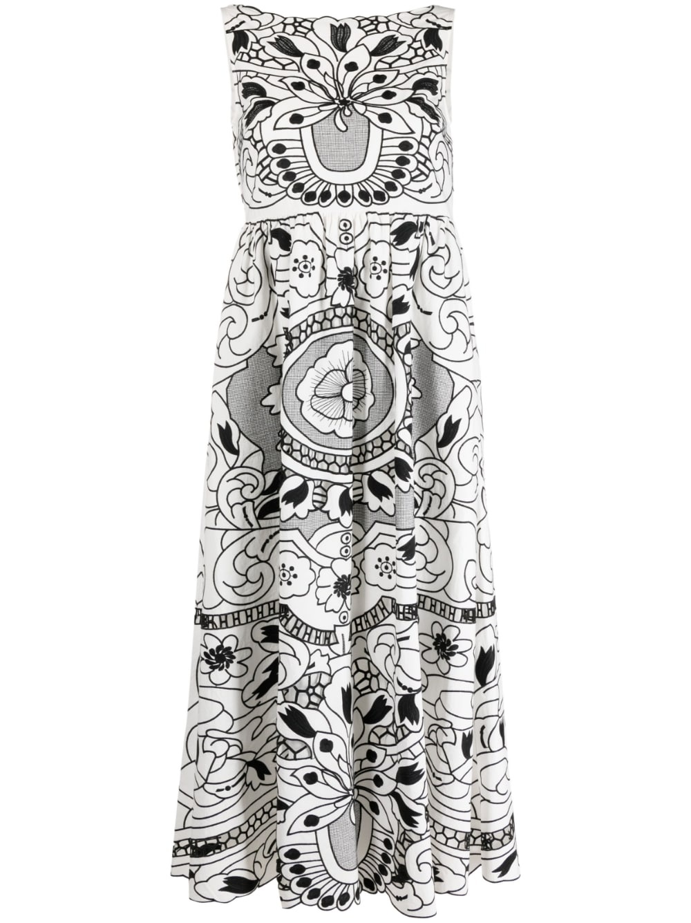 graphic-print sleeveless dress RED Valentino adds a creative edge to the brand's sophisticated design style on this sleeveless dress. Featuring a sleek silhouette with a V-back, the garment has an all-over graphic print in a refined two-tone palette. Highlights - Black/white - Cotton - All-over graphic print - Round neck - Sleeveless - V-back - A-line Imported Composition Cotton 100%, Polyester 100% SIZE & FIT Model measurements Height 5 ft 10 in(1.79 m) Bust/Chest 31.49 in(80 cm) Hips 35.03 in(89 cm) Waist 23.62 in(60 cm) Washing instructions Dry Clean Only