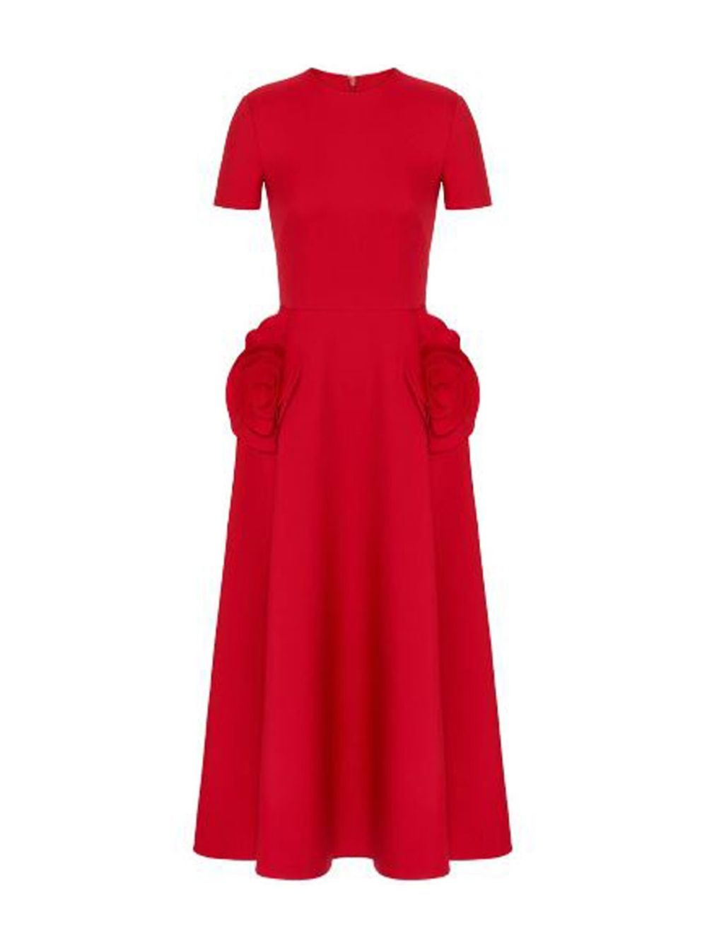Valentino Rose Pocket Midi Dress Valentino Garavani's roses are out in full force with this unique short-sleeve dress. The midi length and crew neck create a timeless elegance, while the large roses covering the side pockets add an interesting detail to an otherwise simple, understated design. Highlights - Valentino garavani's roses are out in full force with this unique short-sleeve dress. the midi length and crew neck create a timeless elegance, while the large roses covering the side pockets add an interesting detail to an otherwise simple, understated design. Made in Italy Composition Virgin Wool 65%, Silk 35%