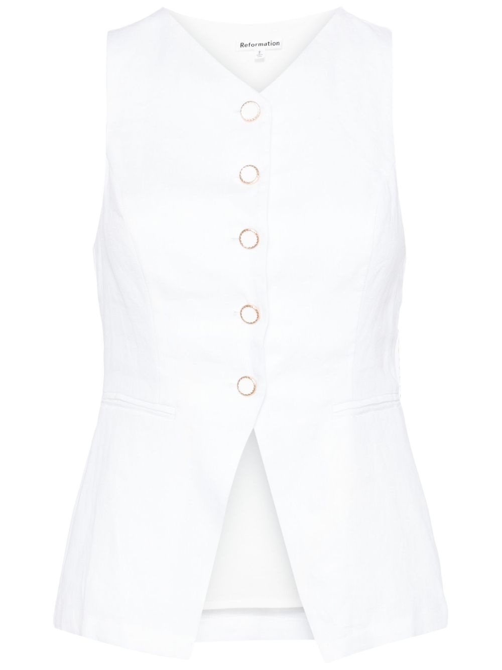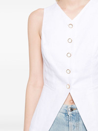 Aspen linen top Highlights - White - Organic cotton/linen - V-neck - Front button fastening - Two side welt pockets - Sleeveless - Straight hem Imported Composition Lining: Organic Cotton 100% Outer: Linen/Flax 100% SIZE & FIT Model measurements Height 5 ft 9 in(1.76 m) Bust/Chest 31.1 in(79 cm) Hips 35.03 in(89 cm) Waist 24.4 in(62 cm) FittingInformation Designed for a slim fit that sits just away from the body offering a close yet comfortable fit The dart stitching adds structure and a closer fit in the torso of this piece Made from a midweight non-stretch fabric This piece fits true to size – take your usual size