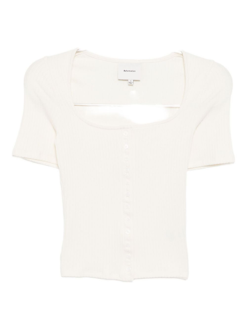 Kaiden top Highlights - Off-white - Front button fastening - Short sleeves Made in United States Composition TENCEL™ Lyocell (LENZING) 45%, Organic Cotton 45%, Spandex/Elastane 10% SIZE & FIT Model measurements Height 5 ft 9 in(1.76 m) Bust/Chest 32.28 in(82 cm) Hips 35.82 in(91 cm) Waist 25.59 in(65 cm) FittingInformation Designed for a close fit throughout Made from a midweight stretch fabric, this piece offers elasticity and flexibility when worn Washing instructions Machine Wash