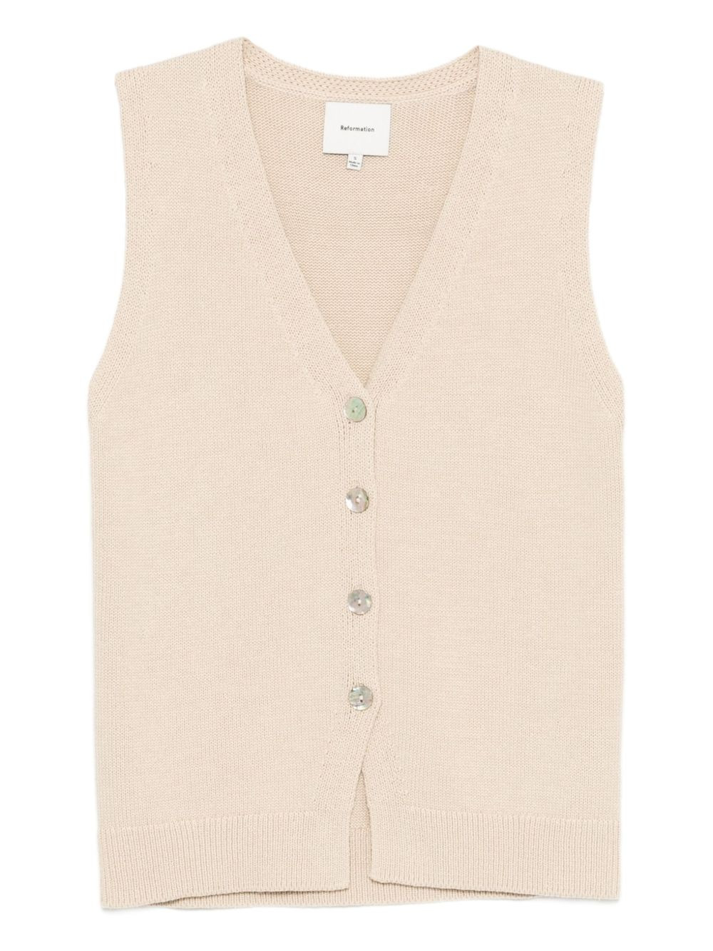 Linden vest Highlights - Beige - Front button fastening - Ribbed v-neck - Sleeveless - Ribbed hem Imported Composition Organic Cotton 100% Washing instructions Machine Wash