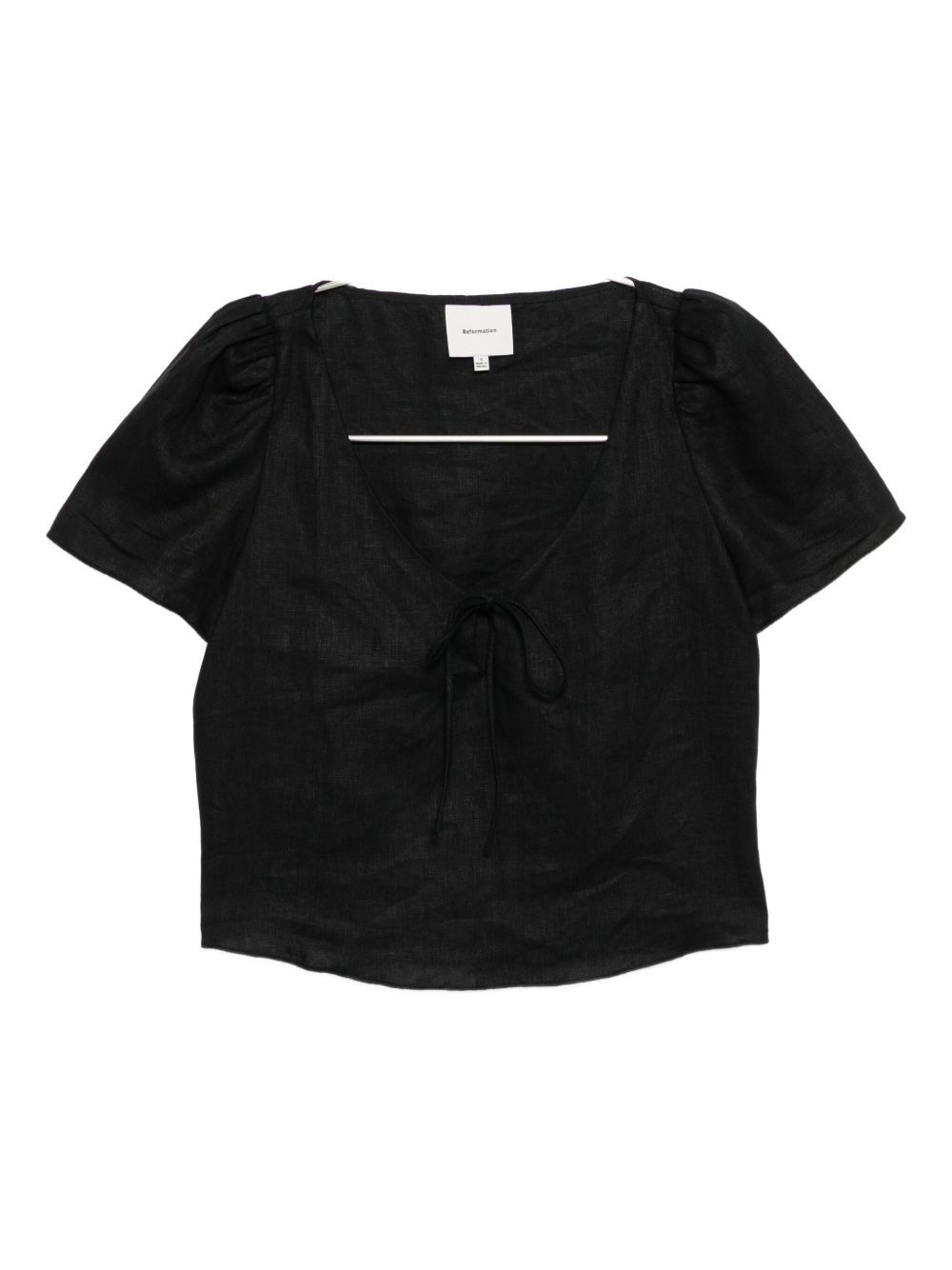 Mayla top Highlights - Black - Front tie fastening - Plunging v-neck - Short sleeves Imported Composition Linen/Flax 100% SIZE & FIT Model measurements Height 5 ft 9 in(1.76 m) Bust/Chest 32.28 in(82 cm) Hips 35.82 in(91 cm) Waist 25.59 in(65 cm) FittingInformation Designed for a relaxed fit, this piece allows for comfort and movement when worn Made from a midweight non-stretch fabric Washing instructions Machine Wash