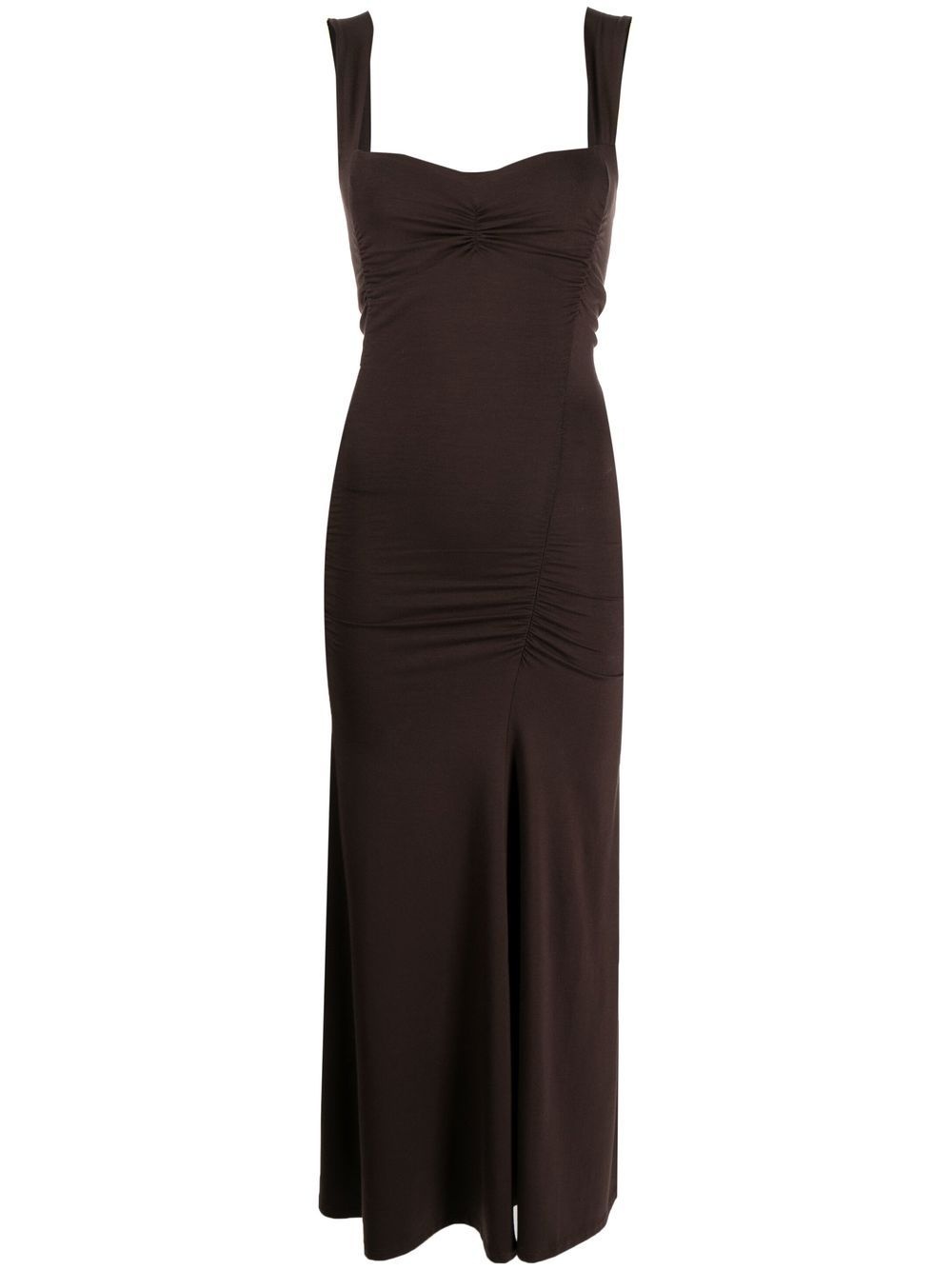 Suvi ruched midi dress Boasting a romantic sweetheart neckline, the Suvi knit dress from Reformation is defined by the fitted ruched design to the sides. The mid-length garment is presented in a classic brown hue for SS23. Highlights - Chocolate brown - Stretch-design - Ruched detailing - Sweetheart neck - Sleeveless - Mid-length Made in United States Composition Lyocell 88%, Spandex/Elastane 12% SIZE & FIT Model measurements Height 5 ft 9 in(1.76 m) Bust/Chest 29.13 in(74 cm) Hips 33.07 in(84 cm) Waist 22.83 in(58 cm) FittingInformation This piece fits true to size. We recommend you get your regular size Designed for a close fit at the bust, waist and hips Made with a mid-weight stretch fabric Washing instructions Machine Wash