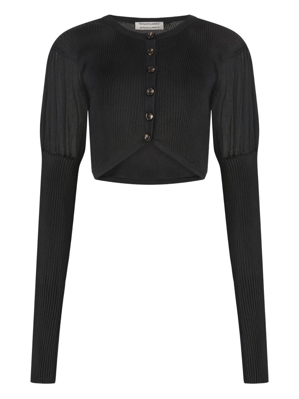 ribbed cardigan Highlights - Black - Front button fastening - Round neck - Juliet sleeves - Cropped Made in Italy Composition Polyester 100% Washing instructions Read Manufacturer Guidelines