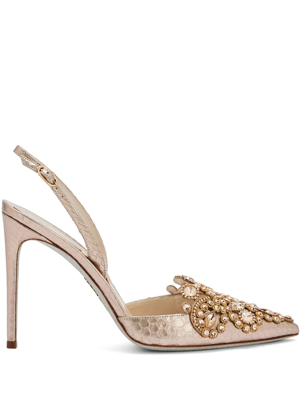 105mm crystal pumps Highlights - Beige - Buckle-fastening slingback strap - Crystal embellishment - Lace detailing - Stiletto heel Made in Italy Composition Outer: Calf Leather 100%, Silk 100% Lining: Calf Leather 100% Sole: Calf Leather 100%, Glitter 100% SIZE & FIT Measurement HEEL 4.13 in(10.5 cm)