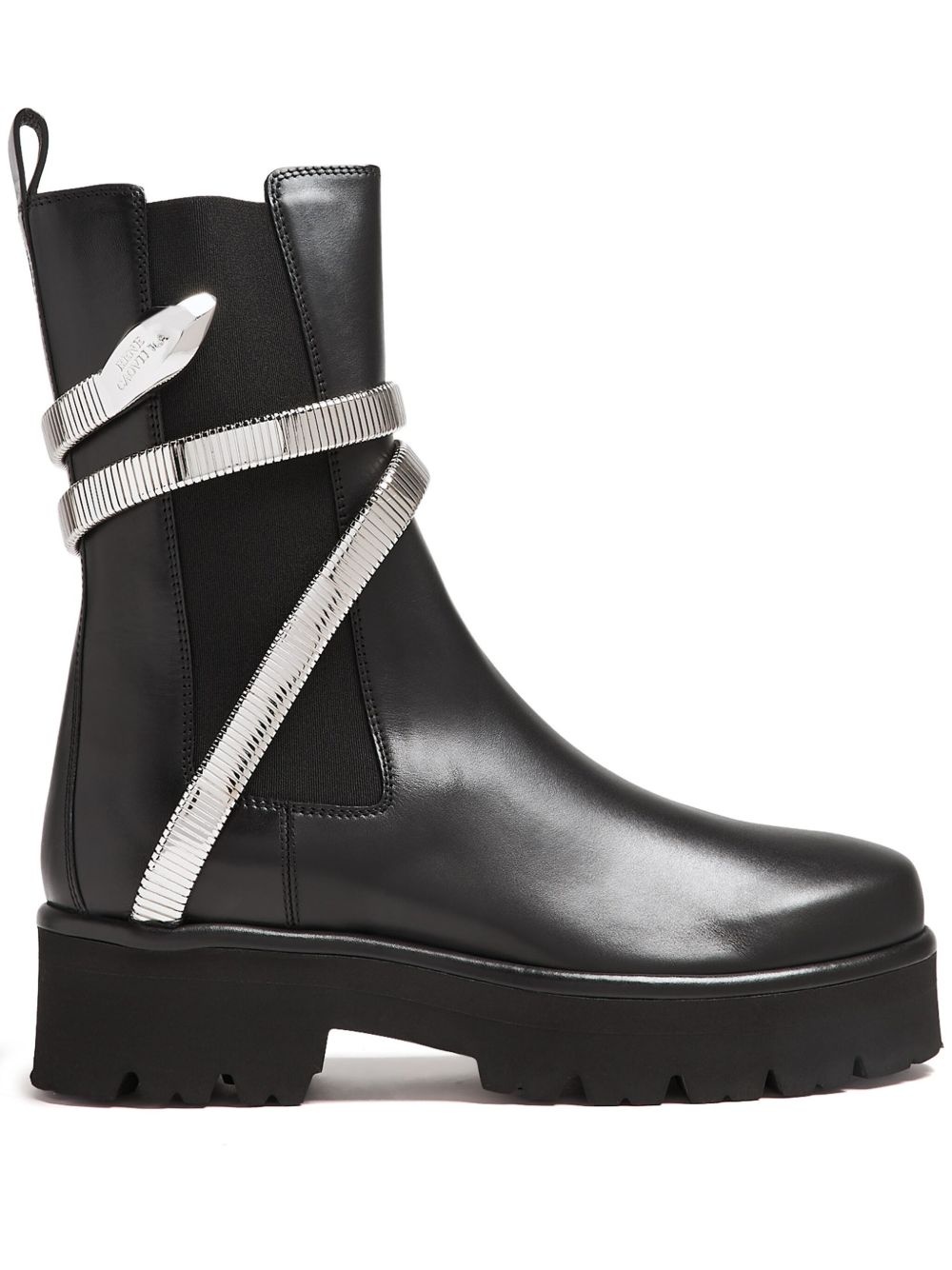 45mm Juniper boots Highlights - Black - Calf leather - Elasticated side panels - 45mm block heel - Pull-tab at the heel - Metallic snake detail - Round toe - Mid-calf length - Branded leather insole - Rubber lug sole Made in Italy Composition Leather 100% SIZE & FIT Measurement HEEL 1.96 in(5 cm) HEIGHT 8.46 in(21.5 cm) Sole height 1.37 in(3.5 cm)