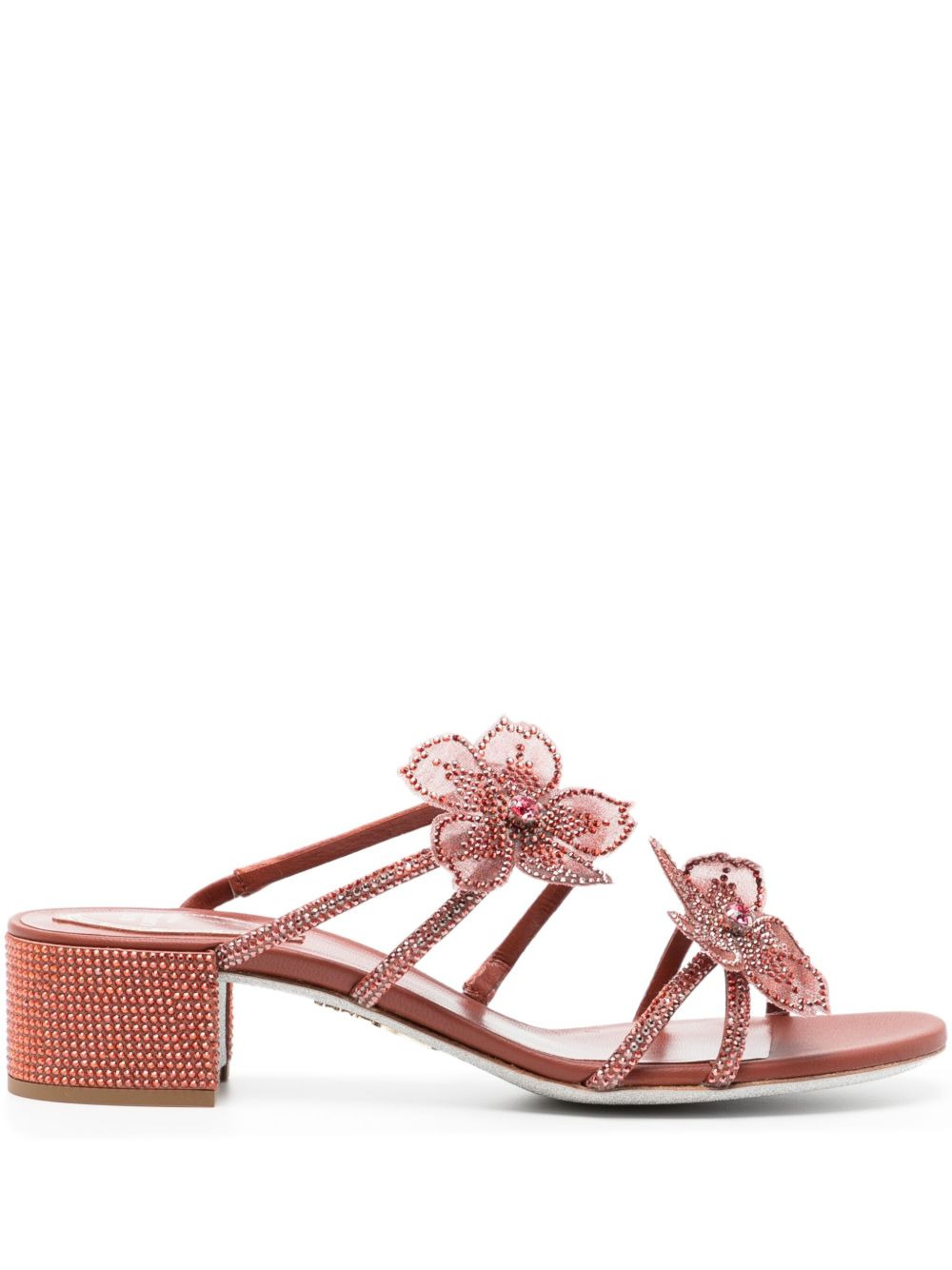 50mm Peach Flower sandals Highlights - Chestnut brown - Slip-on style - Block heel - Floral applique - Crystal embellishment Made in Italy Composition Sole: Calf Leather 90%, Rubber 10% Lining: Leather 100% Outer: Satin 100% SIZE & FIT Measurement HEEL 1.96 in(5 cm)