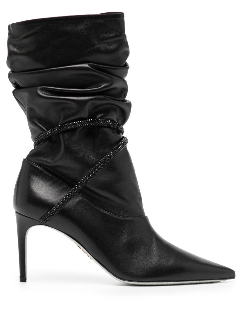 80mm ruched leather boots Highlights - Black - Calf leather - Ruched detailing - Crystal embellishment - Pointed toe - Slip-on style - 80mm high heel Made in Italy Composition Leather 100% SIZE & FIT Measurement CIRCUMFERENCE 12.99 in(33 cm) HEEL 3.14 in(8 cm) HEIGHT 8.66 in(22 cm)