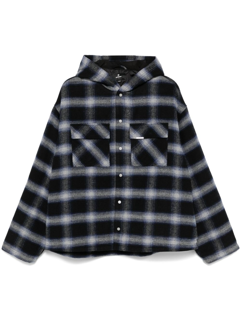 checked jacket Highlights - Midnight blue/grey - Flannel - Check pattern - Front press-stud fastening - Slouchy hood - Drop shoulder - Long sleeves with cuff zips - Two chest flap pockets - Logo plaque to the chest - Two side inset pockets - Short side slits - Full lining - Straight hem Made in United Kingdom Composition Outer: Acrylic 51%, Polyester 28%, Wool 21% Lining: Polyester 100% SIZE & FIT Model measurements Height 6 ft 1 in(1.85 m) Bust/Chest 35.82 in(91 cm) Hips 37.79 in(96 cm) Waist 29.13 in(74 cm) FittingInformation Designed for a boxy fit, intended for a loose fit throughout Made from a padded non-stretch fabric, giving it no natural elasticity