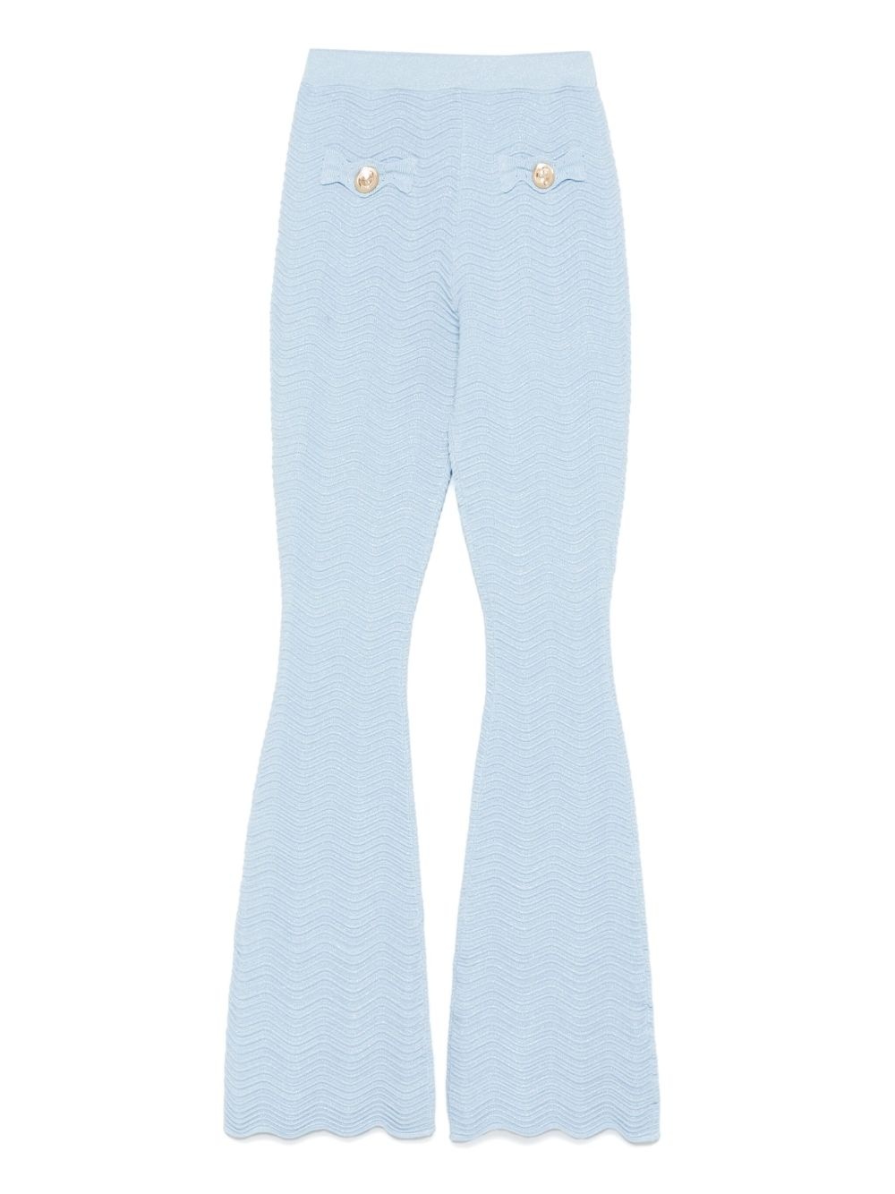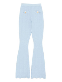 Joliet trousers Highlights - Light blue - Elasticated waistband - Decorative button detailing Imported Composition Rayon 60%, Nylon 32%, Metallised Fibres 5%, Spandex/Elastane 3% SIZE & FIT Model measurements Height 5 ft 10 in(1.79 m) Bust/Chest 33.07 in(84 cm) Hips 35.82 in(91 cm) Waist 24.01 in(61 cm) FittingInformation Designed with a flared hem, these trousers allow for a close fit at the waist with a slim fit over the leg and widening towards the hem The elasticated waist allows for a comfortable fit Made from a midweight stretch fabric, this piece offers elasticity and flexibility when worn