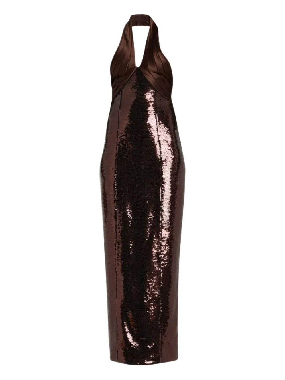 sequin halterneck midi dress Highlights - Brown - Sequin embellishment - Halterneck - Open back - Rear slit Imported Composition Fabric 100% Washing instructions Read Manufacturer Guidelines