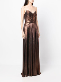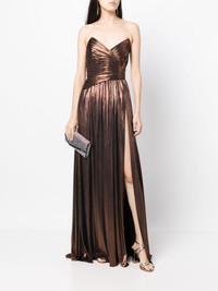 Waldorf floor-length dress brown lame effect metallic effect ruched detailing strapless concealed side zip fastening side slit floor-length Made in United States Composition Polyester 95%, Spandex/Elastane 5% SIZE & FIT Model measurements Height 5 ft 10 in(1.78 m) Bust/Chest 30.7 in(78 cm) Hips 36.22 in(92 cm) Waist 23.62 in(60 cm) FittingInformation This piece fits true to size. We recommend you get your regular size Designed for a close fit at the bust and waist, but loose at the hip Made with a heavyweight stretch fabric Washing instructions Hand Wash