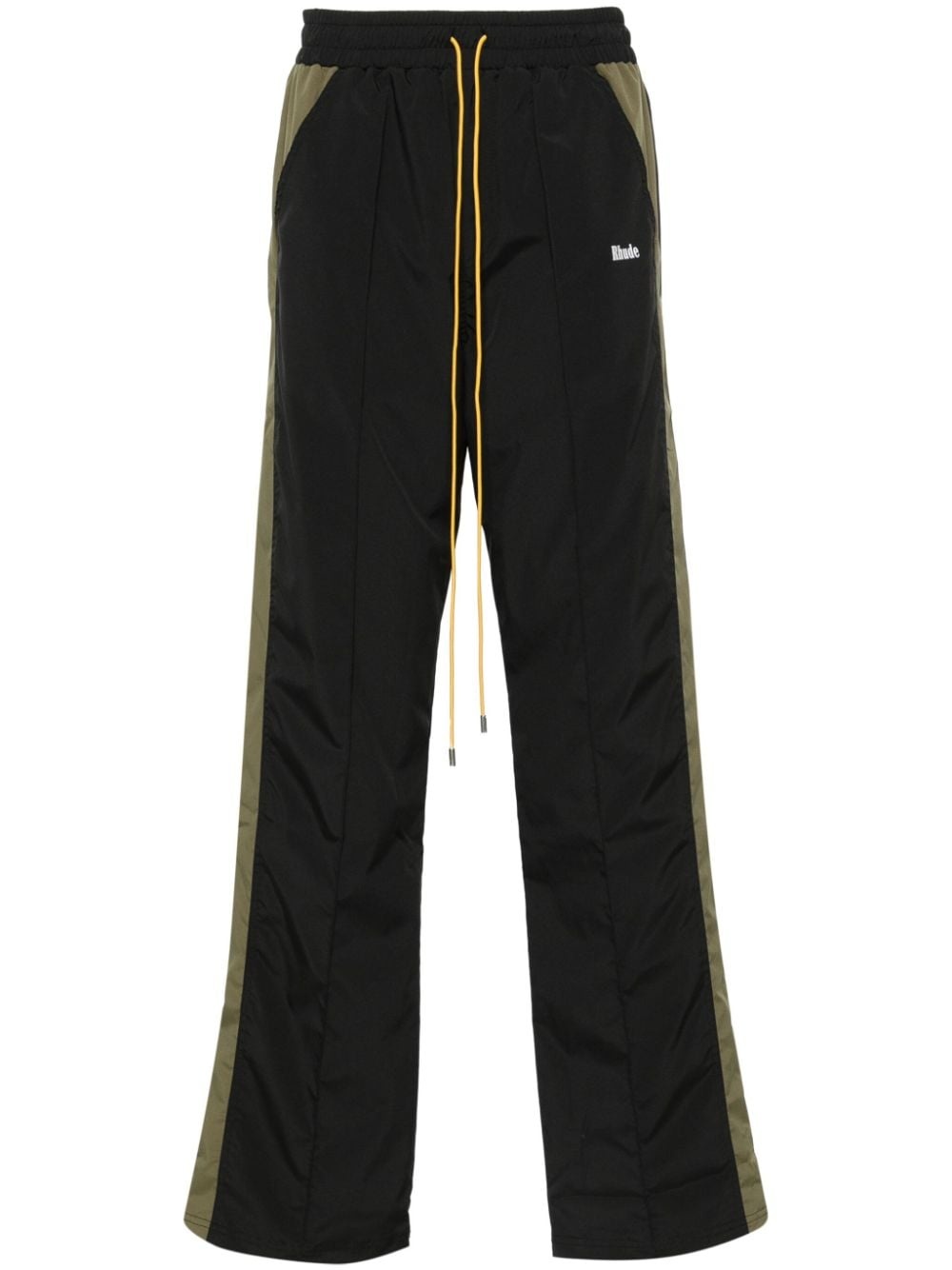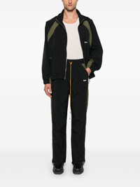 Aerial track pants Highlights - Black/olive green - Colour-block panelled design - Elasticated drawstring waistband - Pintuck detailing - Two diagonal pockets to the sides - Two rear patch pockets - Logo print to the front Made in United States Composition Polyester 100% SIZE & FIT Model measurements Height 6 ft 2 in(1.87 m) Bust/Chest 37.79 in(96 cm) Hips 37.79 in(96 cm) Waist 30.31 in(77 cm) FittingInformation Designed for a straight-leg, allowing for an unrestricted and comfortable fit over the leg The elasticated waist allows for a comfortable fit Made from a lightweight non-stretch fabric Washing instructions Dry Clean Only