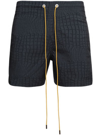 animal-print drawstring-waist swim shorts Highlights - Black - Animal print - Mid-rise - Elasticated drawstring waistband - Two side slit pockets - Short side slits - Thigh-length - Be mindful to try on swimwear over your own garments. Imported Composition Nylon 100% Washing instructions Machine Wash