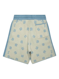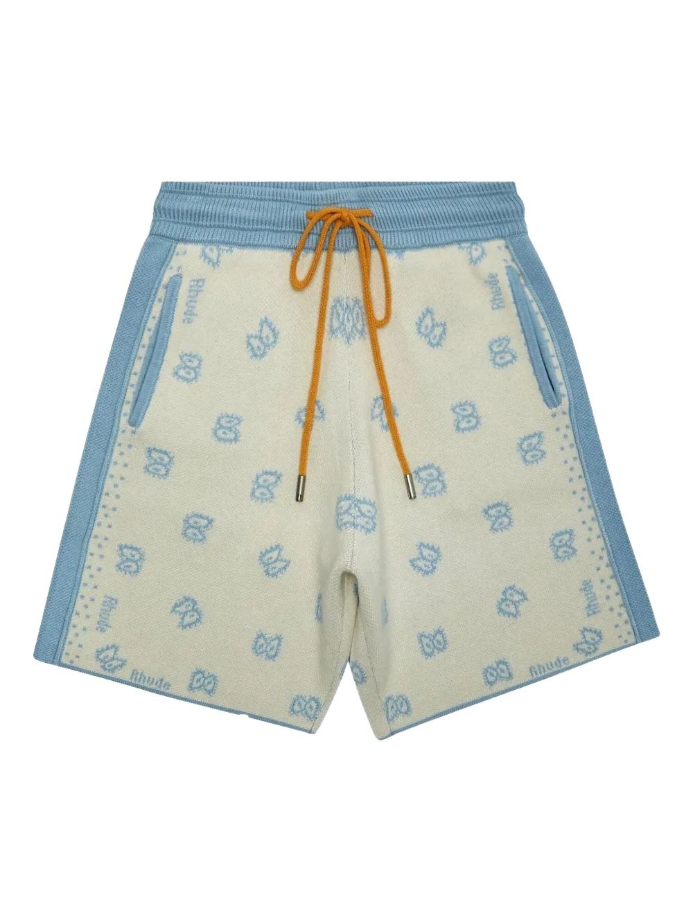 Banco "Stone Blue/Ivory" knitted shorts Highlights - Ivory white - Elasticated drawstring waistband - Ribbed waistband - Intarsia knit - Two side welt pockets - Rear patch pocket Made in United States Composition Supima Cotton 85%, Cashmere 15%