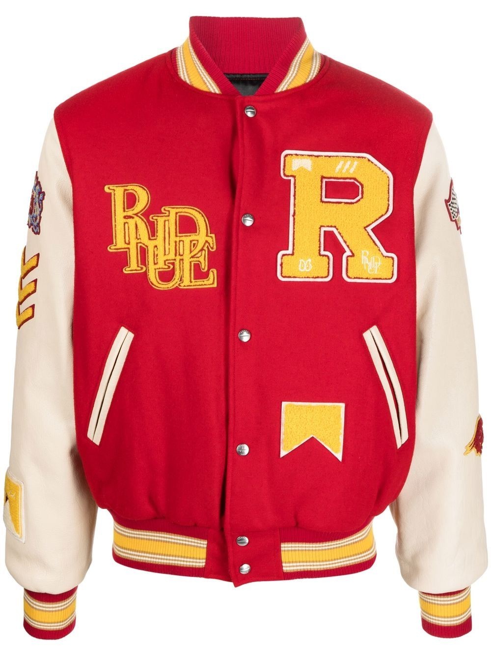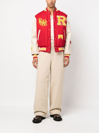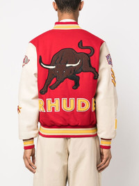Bull Market varsity jacket bright red/multicolour stretch-cotton/lambskin embroidered design baseball collar contrasting-fabric sleeves stripe trim two side welt pockets Imported Composition Outer: Lamb Skin 100%, Cotton 95%, Wool 60%, Viscose 40%, Spandex/Elastane 5% Lining: Polyester 100% SIZE & FIT Model measurements Height 6 ft 2 in(1.87 m) Bust/Chest 38.18 in(97 cm) Hips 36.61 in(93 cm) Waist 29.13 in(74 cm) FittingInformation This piece fits true to size. We recommend you get your regular size Cut for a loose fit Made with a mid-weight fabric Washing instructions Dry Clean Only