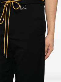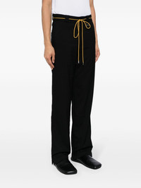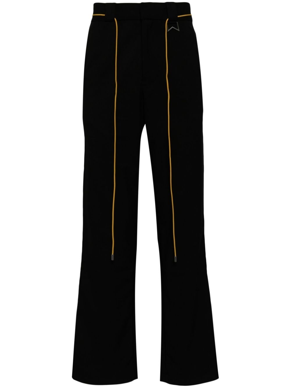 Classic straight-leg trousers RHUDE's Classic trousers are named after their trio of tried-and-tested design elements – from the twill fabric and solid-black palette to the straight-leg profile. A mustard-yellow shoelace and chevron D-ring at the belt loops nod to the brand’s streetwear influences. Highlights - Black - Twill weave - Detachable waist belt - Chevron d-ring - Concealed front fastening - Belt loops - Two side slit pockets - Rear patch pocket - Straight leg Made in United States Composition Outer: Polyester 63%, Viscose 34%, Spandex/Elastane 3% Lining: Lyocell 100% SIZE & FIT Model measurements Height 6 ft 2 in(1.88 m) Bust/Chest 31.88 in(81 cm) Hips 35.82 in(91 cm) Waist 27.55 in(70 cm) FittingInformation Designed for a straight-leg, allowing for an unrestricted and comfortable fit over the leg Made from a midweight stretch fabric, this piece offers elasticity and flexibility when worn This piece fits true to size – take your usual size Washing instructions Dry Clean Only