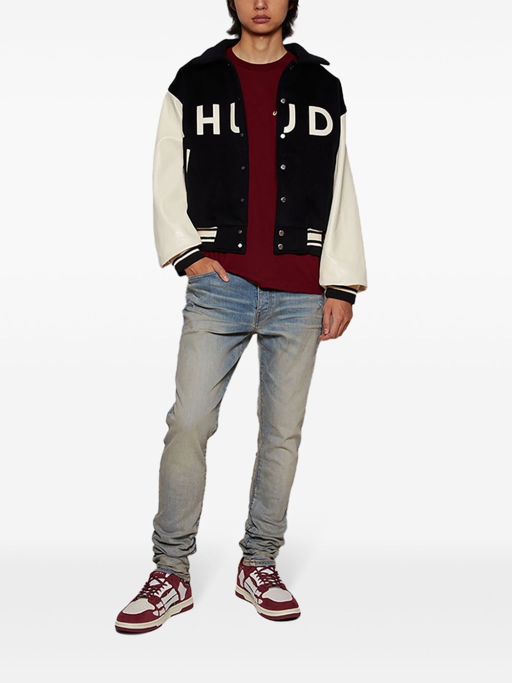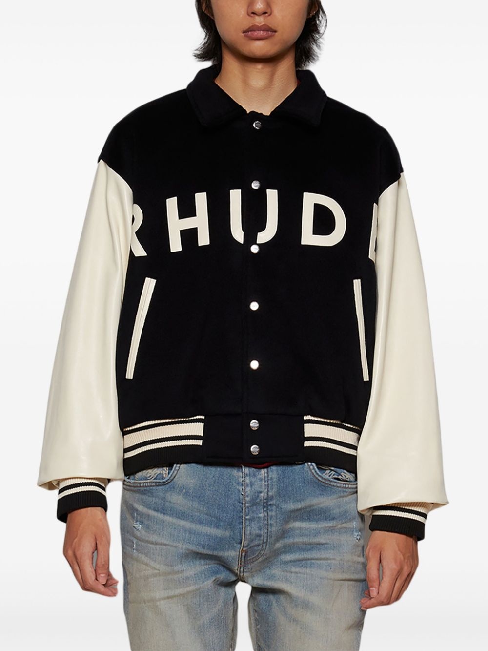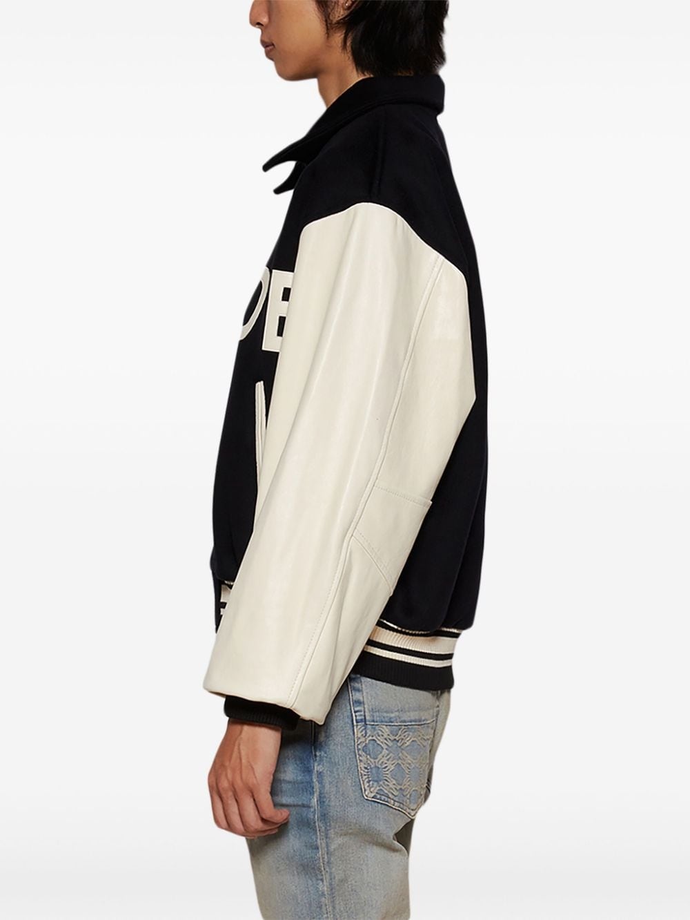 Collegiate bomber jacket Highlights - Black/white - Wool/lyocell/lambskin - Front press-stud fastening - Logo print to the front - Baseball collar - Two side slit pockets - Long sleeves - Straight hem - This item contains at least 50% materials which are certified or widely recognised as having a lower environmental impact through production and/or manufacturing processes that reduce water consumption and the use of harmful chemicals, or re-use by-products of the production process. - Learn more about what makes a product conscious on our conscious criteria page Made in United States Composition Outer: Wool 100%, Lambskin 100%, Polyester 100% Lining: Lyocell 100%