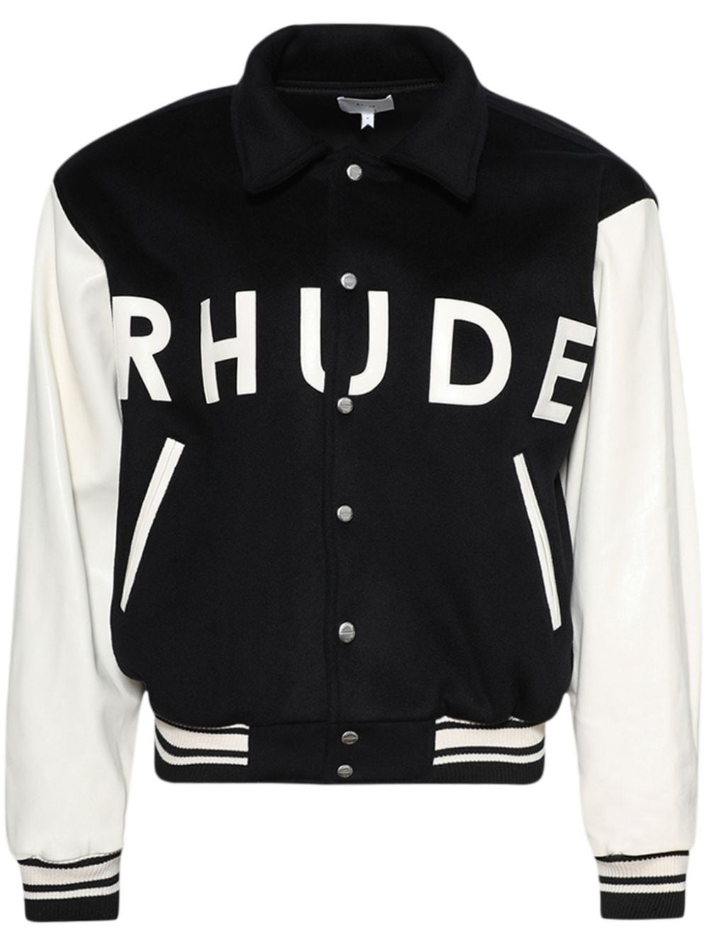 Collegiate bomber jacket Highlights - Black/white - Wool/lyocell/lambskin - Front press-stud fastening - Logo print to the front - Baseball collar - Two side slit pockets - Long sleeves - Straight hem Made in United States Composition Outer: Wool 100%, Lambskin 100%, Polyester 100% Lining: Lyocell 100% SIZE & FIT Measurement CHEST 51.96 in(132 cm) SLEEVE LENGTH 37.79 in(96 cm) LENGTH 24.8 in(63 cm) WAIST 44.88 in(114 cm) Shoulder Width 22.44 in(57 cm)