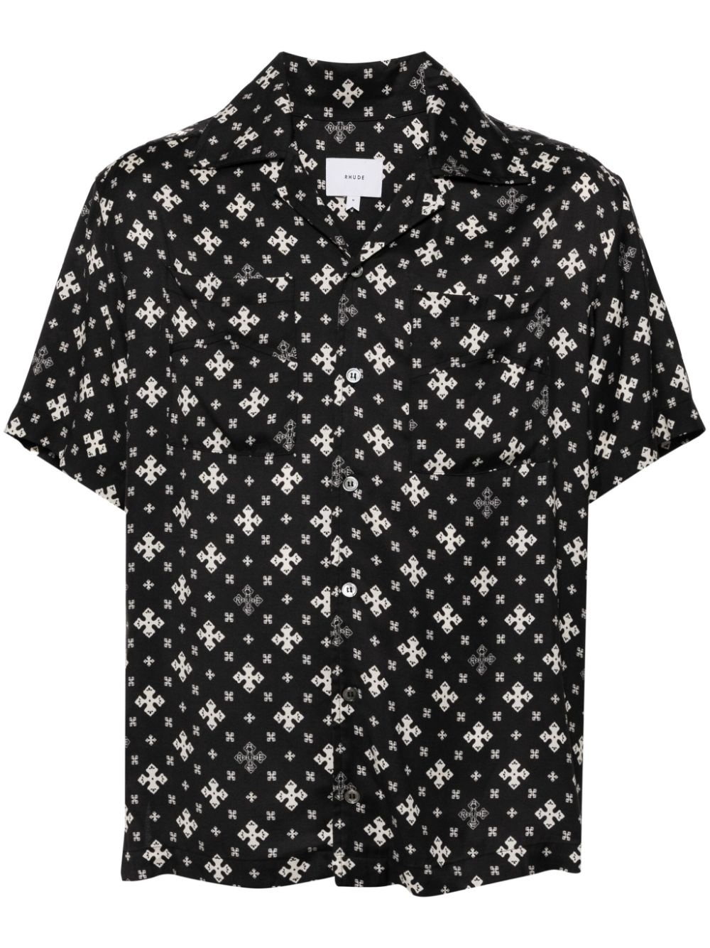 cross bandana shirt Highlights - Black/white - Front button fastening - All-over graphic print - Two chest patch pockets - Short sleeves - Straight hem Made in United States Composition Rayon 100% SIZE & FIT Model measurements Height 6 ft 2 in(1.87 m) Bust/Chest 33.07 in(84 cm) Hips 35.43 in(90 cm) Waist 26.77 in(68 cm) FittingInformation Designed to be unstructured, offering a loose fit throughout Made from a lightweight non-stretch fabric