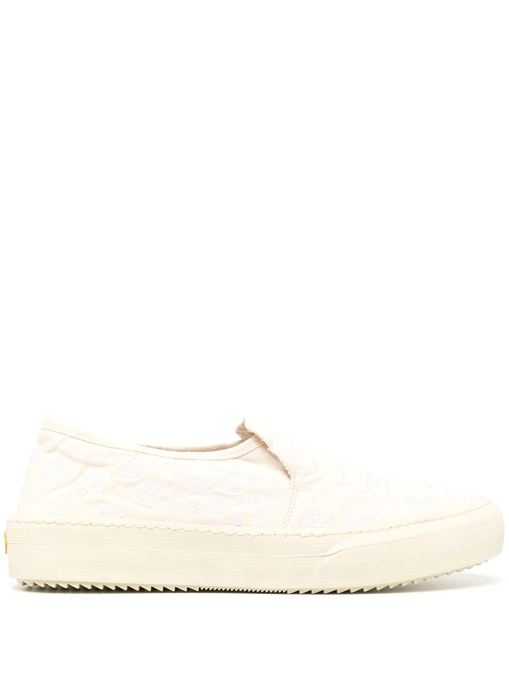 embroidered-design slip-on sneakers off-white embroidered design embossed logo to the rear almond toe slip-on style branded insole chunky rubber sole Made in Italy Composition Outer: Fabric 100% Lining: Fabric 100% Sole: Rubber 100% SIZE & FIT Measurement Sole height 1.57 in(4 cm) Washing instructions Read Manufacturer Guidelines