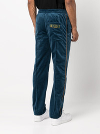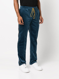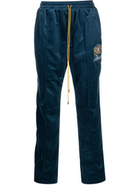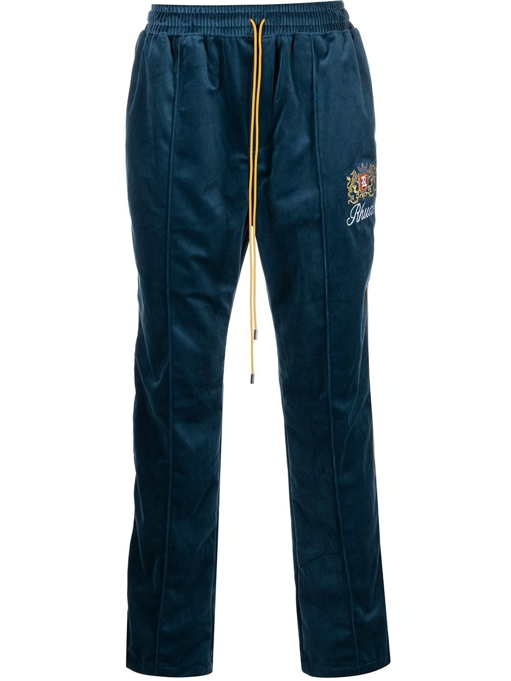 embroidered velvet track pants Detailed with an embroidered crest-style logo at the leg, these teal-blue track pants by R H U D E are complete with the brand's signature exaggerated mustard drawstrings. Made in United States Composition Polyester 100% SIZE & FIT Model measurements Height 6 ft 2 in(1.88 m) Bust/Chest 38.18 in(97 cm) Hips 35.82 in(91 cm) Waist 29.92 in(76 cm)